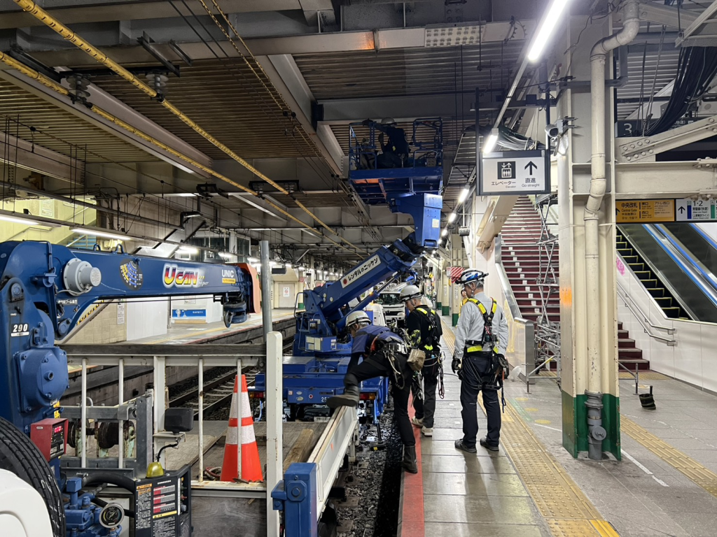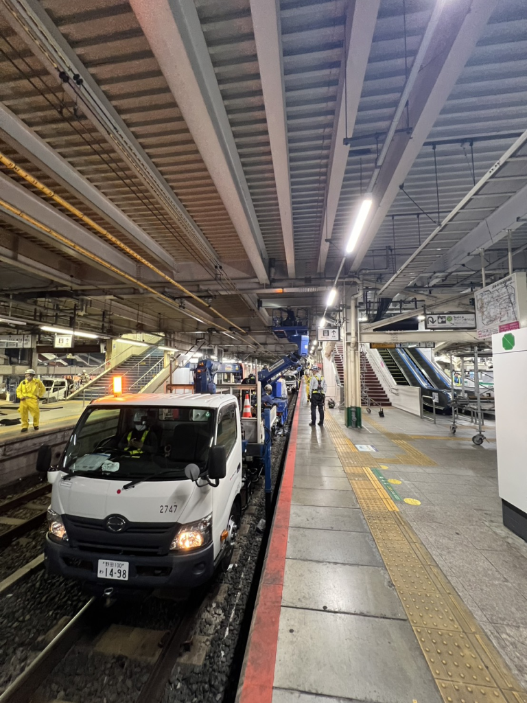 線路内に軌陸車を入線させて高所作業車を使用して鉄骨部材を取付けて行く作業です
