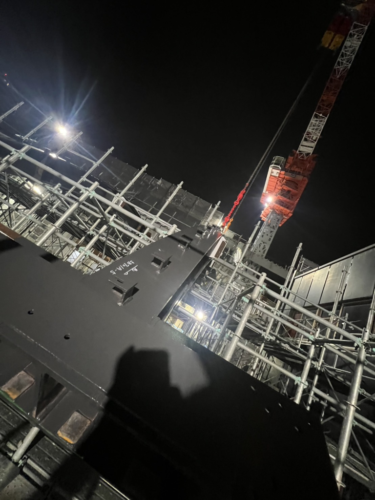 タワークレーンを使用して鉄骨を組み立てて行く作業です