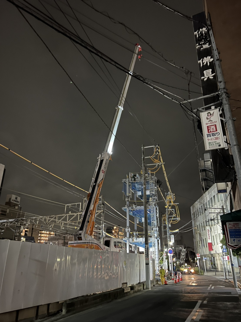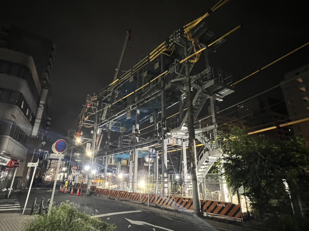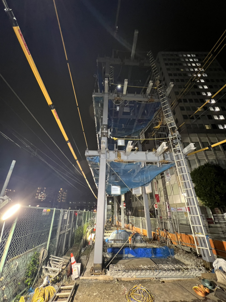 ラフタークレーンを使用して鉄骨を組み立てて行く作業です